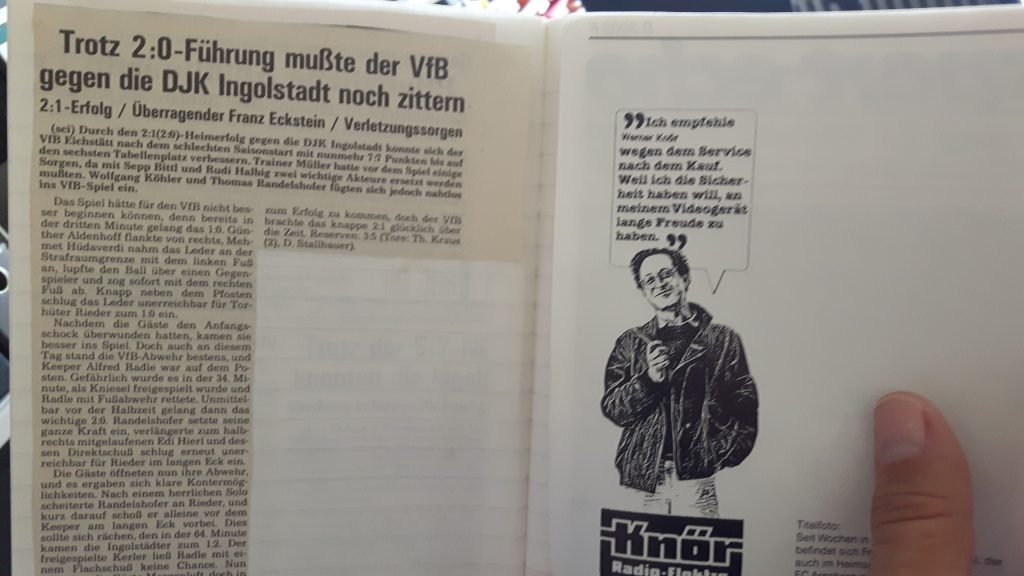 Anmerkung des Verfassers: Das Foto zeigt Franz Eckstein (rechts) beim Kreisliga-Derby des VFB Eichstätt gegen den TV 1861 Ingolstadt in der Saison 1987/1988.