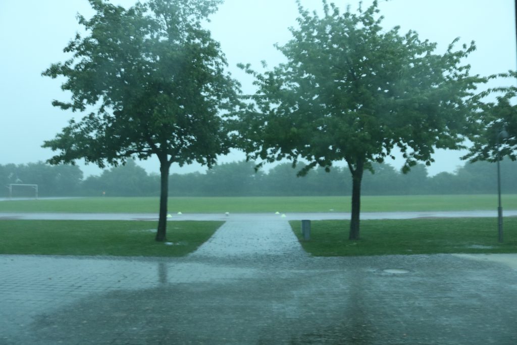 Die Fans: Fans hat man vergeblich gesucht. Das lag vermutlich am schlechten Wetter. Aber die wenigen Fans die da waren, waren als Blitz und Donner einsetzte, nicht nur mit dem Spiel beschäftigt. „Wir müssen die Sekunden zwischen Blitz und Donner also durch dreiteilen“, sagte ein Mädchen und schaute vertieft auf ihr Handy. Auch die unterschiedlich langen Blitze, die immer wieder am Himmel aufleiteten, veranlassten so manch einen am Spielfeldrand die Kamera oder das Handy zu zücken.