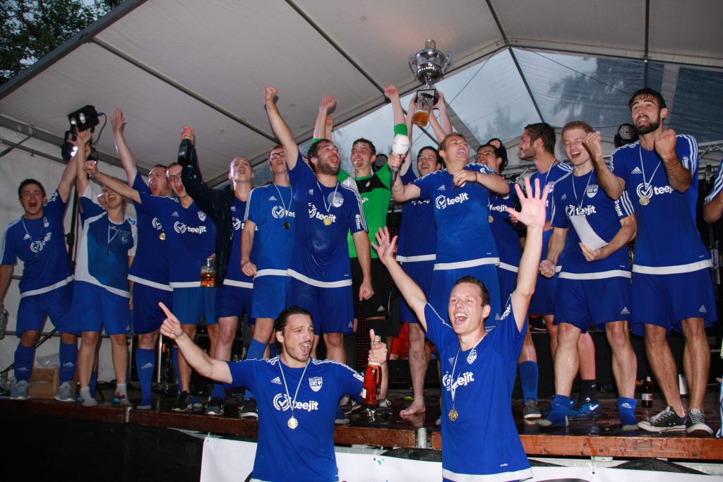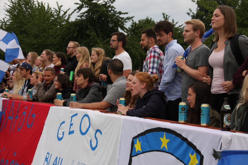 Die Fans: Wie es sich für ein Finale gehört, fanden zahlreiche Fans den Weg zum Seidlkreuz. Dank eines eigenen Busses fanden zum Finale auch endlich zahlreiche Anhänger von der Donau den Weg nach Eichstätt. Wer jetzt mit einem hitzigen Duell auch abseits der Ränge gerechnet hatte, wurde zu Beginn enttäuscht. Beide Fan-Lager waren überraschend passiv. Das änderte sich dann aber schnell, als sich die WFI-Fans einige Geo-Spieler und den Schiri zum Feindbild auserkoren und diese regelmäßig versuchten mit teils grenzwertigen, aber auch amüsanten Gesängen aus dem Konzept zu bringen. Auf Eichstätter Seite sorgten gerade die Sportfreunde Promilla, die als gesamte Mannschaft in Trikots zum Spiel kamen, für gute Stimmung. Im Spielverlauf wachten dann aber aufgrund der guten Geo-Leistung auf dem Platz auch die übrigen Anhänger der Geographen auf. So entwickelte sich nicht nur auf dem Platz ein Schlagabtausch auf Augenhöhe. Nach dem Abpfiff kannte die Freude im Eichstätter Lager natürlich keine Grenzen mehr: Bierdosen flogen und natürlich durfte eine gemeinsame Humba zwischen Mannschaft und Fans nicht fehlen.